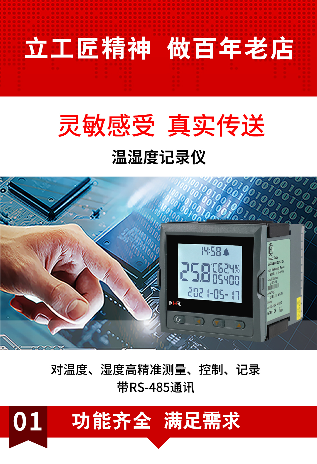 虹潤公司是專業(yè)生產(chǎn)環(huán)境監(jiān)測儀表的國家專精特新“小巨人”企業(yè)。生產(chǎn)的盤裝式溫濕度記錄儀,具有溫度、濕度、露點(diǎn)高精準(zhǔn)的測量,數(shù)據(jù)記錄與轉(zhuǎn)存,配上位機(jī)軟件,繼電器/蜂鳴器雙報(bào)警,帶RS485/RS232通訊輸出等級(jí)等特點(diǎn)。產(chǎn)品獲得一種手持式低功耗溫濕度檢測儀、大屏幕溫濕度記錄儀等2項(xiàng)國家發(fā)明專利,主持起草物聯(lián)網(wǎng)智能溫度儀表通用技術(shù)條件、冷鏈溫度記錄儀等2項(xiàng)國家標(biāo)準(zhǔn),通信系統(tǒng)多通道數(shù)據(jù)采集控制終端規(guī)范軍用標(biāo)準(zhǔn),以及現(xiàn)場設(shè)備集成等5項(xiàng)智能制造國家標(biāo)準(zhǔn),參與國際5G標(biāo)準(zhǔn)制定,取得溫濕度儀表等2項(xiàng)相關(guān)軟件著作權(quán)。產(chǎn)品廣泛應(yīng)用于工業(yè)現(xiàn)場、農(nóng)業(yè)大棚、倉儲(chǔ)物流、地下管廊、養(yǎng)殖孵化、配電機(jī)房等諸多領(lǐng)域。