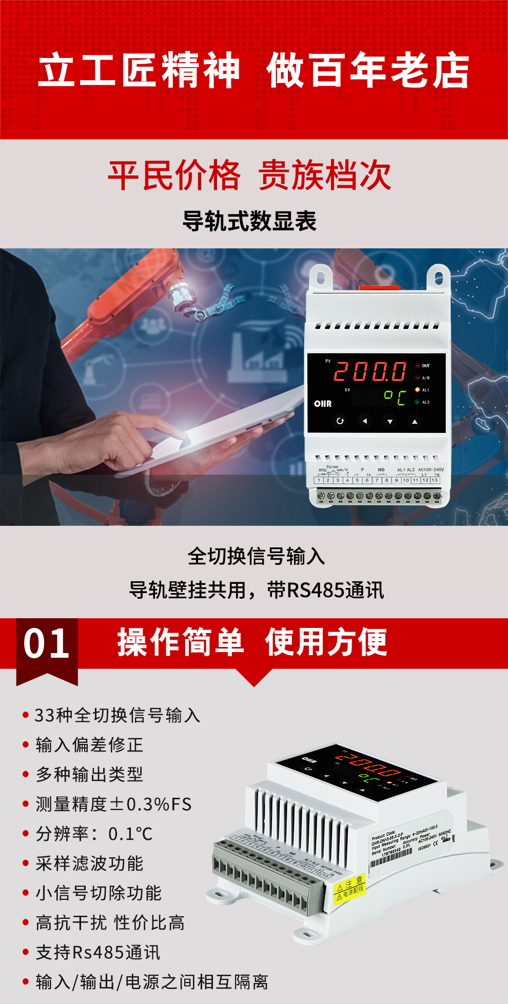 虹潤(rùn)公司是專業(yè)生產(chǎn)數(shù)顯表的國(guó)家專精特新“小巨人”企業(yè),生產(chǎn)的導(dǎo)軌式數(shù)顯儀表,具有全切換信號(hào)輸入,導(dǎo)軌壁掛共用,全隔離設(shè)計(jì),高抗干擾,變送輸出或RS485通訊等特點(diǎn)。產(chǎn)品獲得巡回檢測(cè)顯示方法及裝置、工業(yè)模塊的導(dǎo)軌式安裝結(jié)構(gòu)等2項(xiàng)國(guó)家發(fā)明專利,主持起草工業(yè)過(guò)程控制系統(tǒng)用模擬輸入兩位或多位輸出儀表、物聯(lián)網(wǎng)智能溫度儀表通用技術(shù)條件等2項(xiàng)國(guó)家標(biāo)準(zhǔn),,以及通信系統(tǒng)多通道數(shù)據(jù)采集控制終端規(guī)范軍用標(biāo)準(zhǔn),參與國(guó)際5G標(biāo)準(zhǔn)制定,取得簡(jiǎn)易數(shù)顯儀表等3項(xiàng)相關(guān)軟件著作權(quán)。產(chǎn)品廣泛應(yīng)用于電力、石化、冶金、化工、造紙、食品、輕工、制藥、熱處理、水處理、機(jī)械配套等各種工業(yè)現(xiàn)場(chǎng)。
