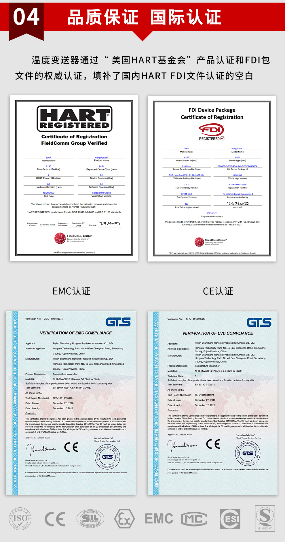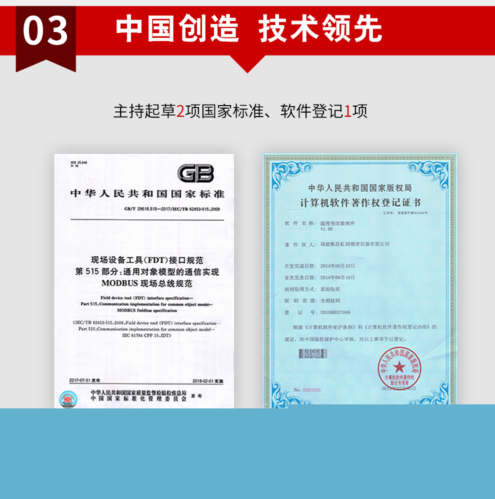 虹潤公司是專業(yè)生產溫度變送器的國家專精特新“小巨人”企業(yè)。生產的現(xiàn)場顯示隔離溫度變送器,具有可修改輸入信號類型,測量精度高,穩(wěn)定性好,帶HART或RS485通訊計等特點。該產品不僅通過德國萊茵 CE 認證與 SIL 功能安全認證,還獲得具備減震抗干擾能力的溫度變送器、信號隔離器、一種二端子模塊、無源信號隔離器等3項國家發(fā)明專利。主持起草物聯(lián)網(wǎng)智能溫度儀表、現(xiàn)場設備工具(FDT)接口規(guī)范、工業(yè)過程測量和控制系統(tǒng)用溫度變送器等3項國家標準,以及通信系統(tǒng)多通道數(shù)據(jù)采集控制終端規(guī)范軍用標準。參與國際5G標準制定,取得高精度溫度變送器等3項相關軟件著作權。產品廣泛應用于石油、化工、電力、冶金、制藥、食品、水處理等各種工業(yè)領域。