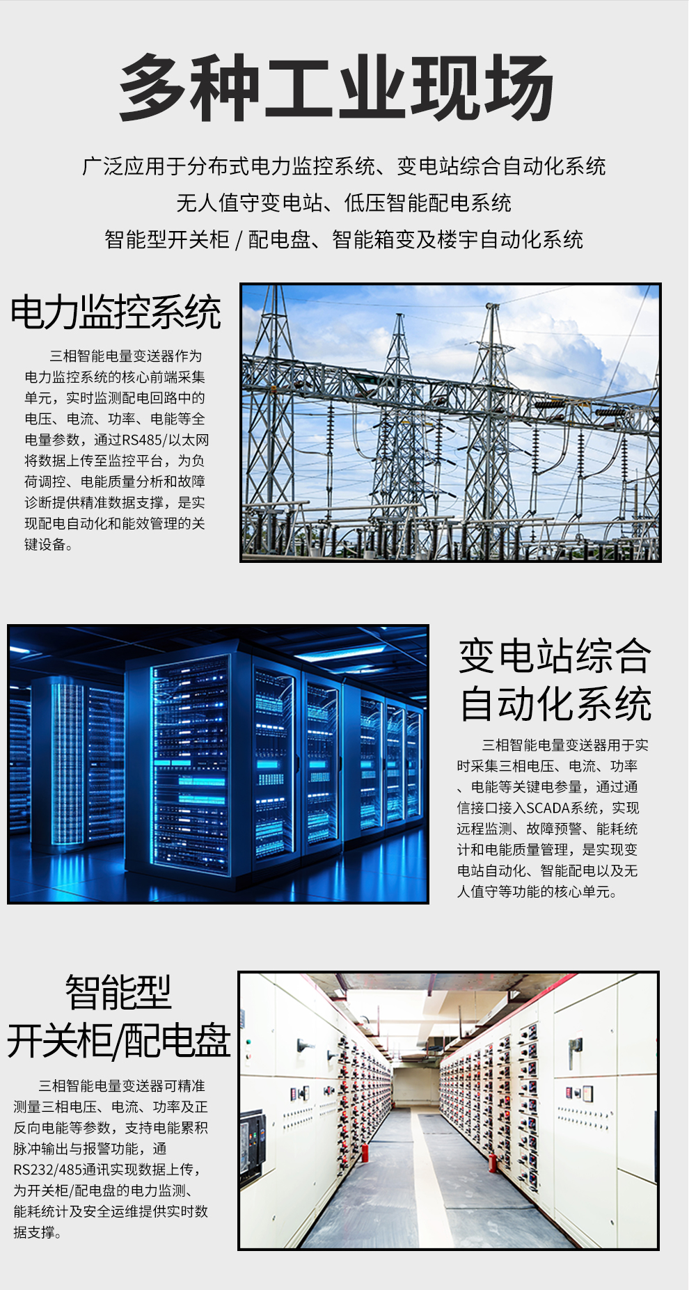 虹潤公司是專業(yè)生產(chǎn)電流傳感器的國家專精特新“小巨人”企業(yè)。生產(chǎn)的三相智能電量變送器,具有多種電參數(shù)測量,正反向電能累積,多種輸出信號,導軌壁掛共用, RS485/RS232通訊等特點。產(chǎn)品獲得基于一種交流信號變送器、交直流信號轉(zhuǎn)換電路、基于DCS技術(shù)的盤裝式三相電量表等3項國家發(fā)明專利,主持起草工業(yè)過程控制系統(tǒng)用模擬輸入兩位或多位輸出儀表國家標準,直流漏電流傳感器規(guī)范、通信系統(tǒng)多通道數(shù)據(jù)采集控制終端規(guī)范等2項軍用標準,以及現(xiàn)場設備集成等5項智能制造國家標準,參與國際5G標準制定,取得液晶綜合電量集中顯示儀等2項相關(guān)軟件著作權(quán)。產(chǎn)品廣泛應用于電力、冶金、化工、水泥、造紙、新能源、基礎(chǔ)設施等用電密集行業(yè)。
